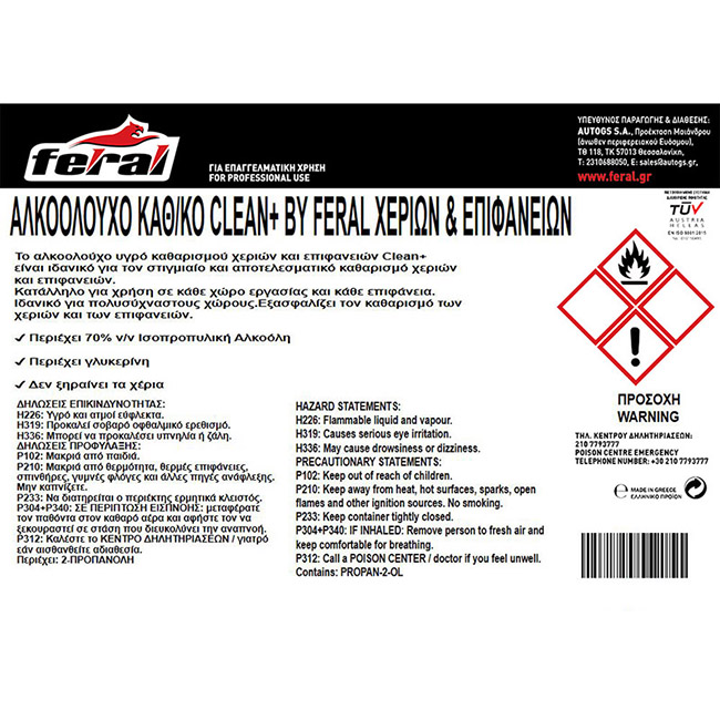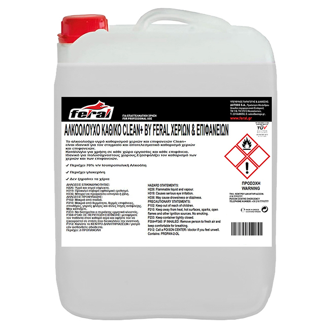 Αλκοολούχο Καθαριστικό Χεριών Και Επιφανειών Clean+ By Feral 10lt 1 Τεμάχιο