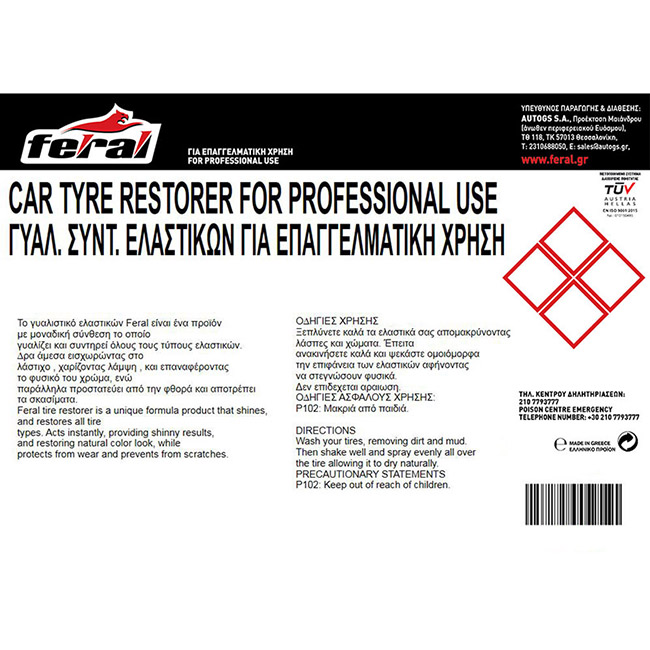 Το γυαλιστικό ελαστικών Feral είναι ένα προϊόν με μοναδική σύνθεση, το οποίο γυαλίζει και συντηρεί όλους τους τύπους των ελαστικών. Δρα άμεσα εισχωρώντας στο λάστιχο, χαρίζοντας λάμψη και επαναφέροντας το φυσικό τους χρώμα, ενώ παράλληλα προστατεύει από την φθορά και αποτρέπει τα σκασίματα.