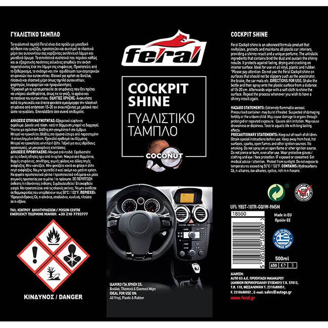Το γυαλιστικό ταμπλό Feral, είναι ένα προϊόν με μοναδική σύνθεση που γυαλίζει, προστατεύει και συντηρεί τα πλαστικά μέρη του αυτοκινήτου σας χαρίζοντας εκπληκτική λάμψη, και μοναδικό άρωμα. Τα αντιστατικά συστατικά που περιέχει καθώς και η εξαιρετικής ποιότητας σιλικόνες απωθούν την σκόνη παρατείνοντας έτσι τη λάμψη της επιφάνειας.
