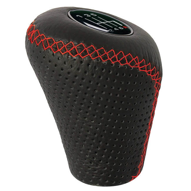 Πόμολο Λεβιέ Ταχυτήτων Δερμάτινο Τρυπητό Οβάλ Μαύρο Με Κόκκινες Ραφές Για Σηκωτή Ή Πατητή Όπισθεν