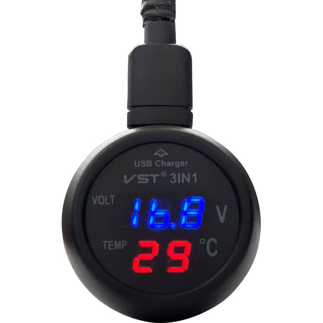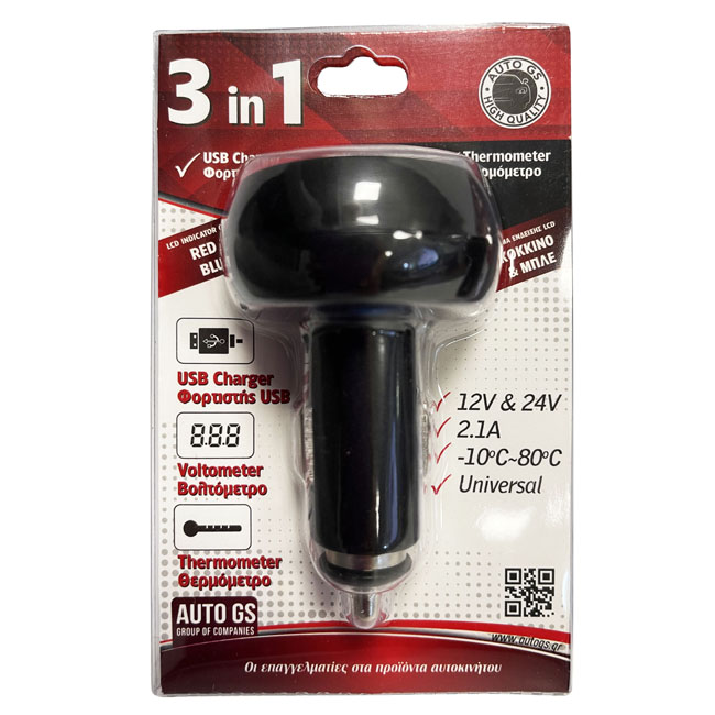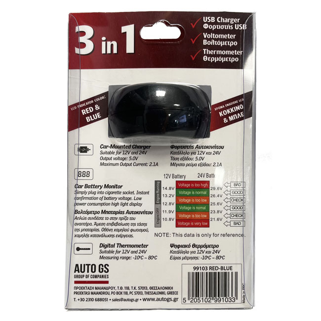 Βολτόμετρο, Θερμόμετρο Και Φορτιστής Αυτοκινήτου Με USB Μαύρο Με Κόκκινα Και Μπλε Νούμερα 1Τμχ