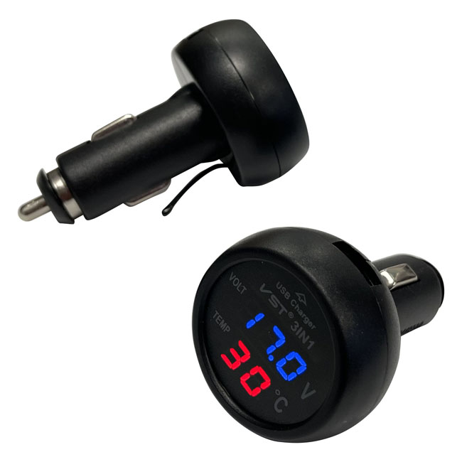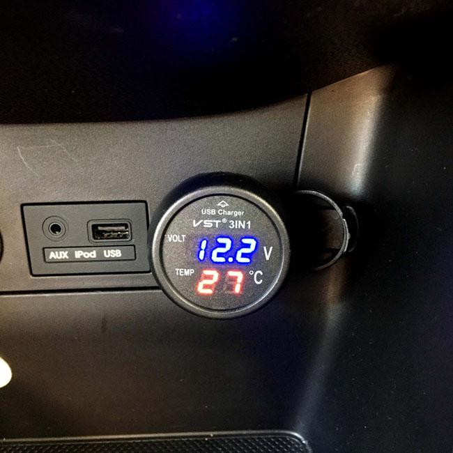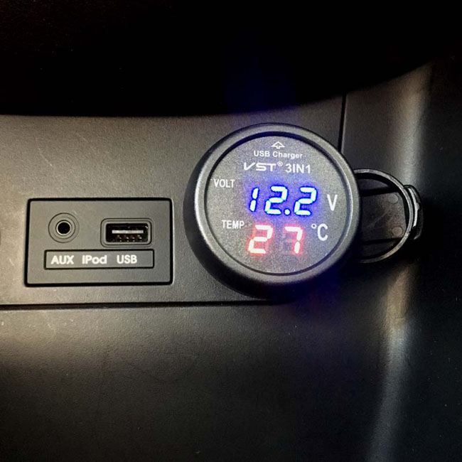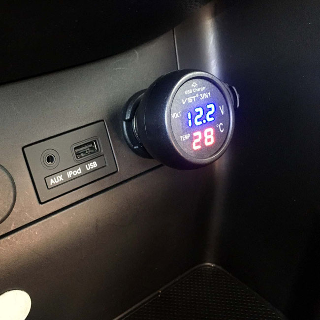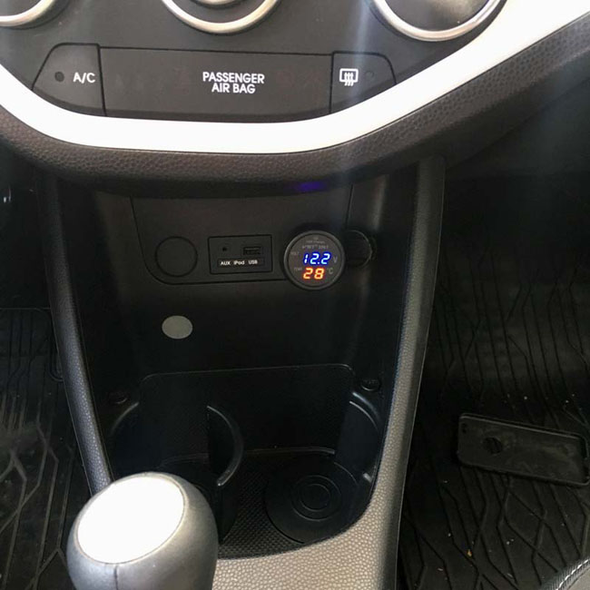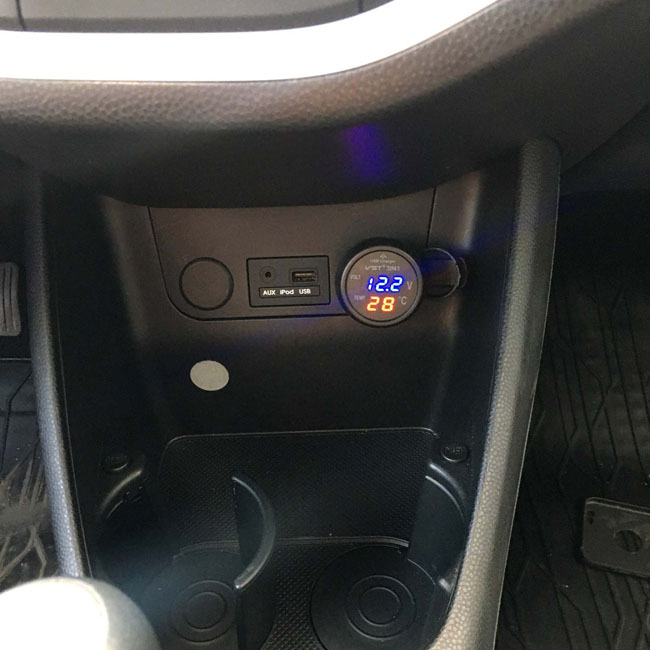Το Όργανο Μέτρησης θερμοκρασίας / Volt Και Φορτιστής USB Εσωτερικού Χώρου, κουμπώνει στον αναπτήρα του αυτοκινήτου και διαβάζει τη θερμοκρασία της καμπίνας και τα Volt τα οποία βγάζει η μπαταρία. Η led οθόνη εμφανίζει κόκκινα και μπλε νούμερα.
